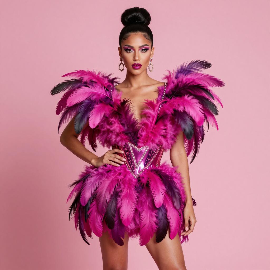 A striking woman poses confidently in a glamorous, vibrant pink feathered outfit that exudes a dramatic and high-fashion carnival or showgirl style. The bold makeup and elegant updo complement the extravagant costume, creating a visually captivating and flamboyant look against a soft pink background.