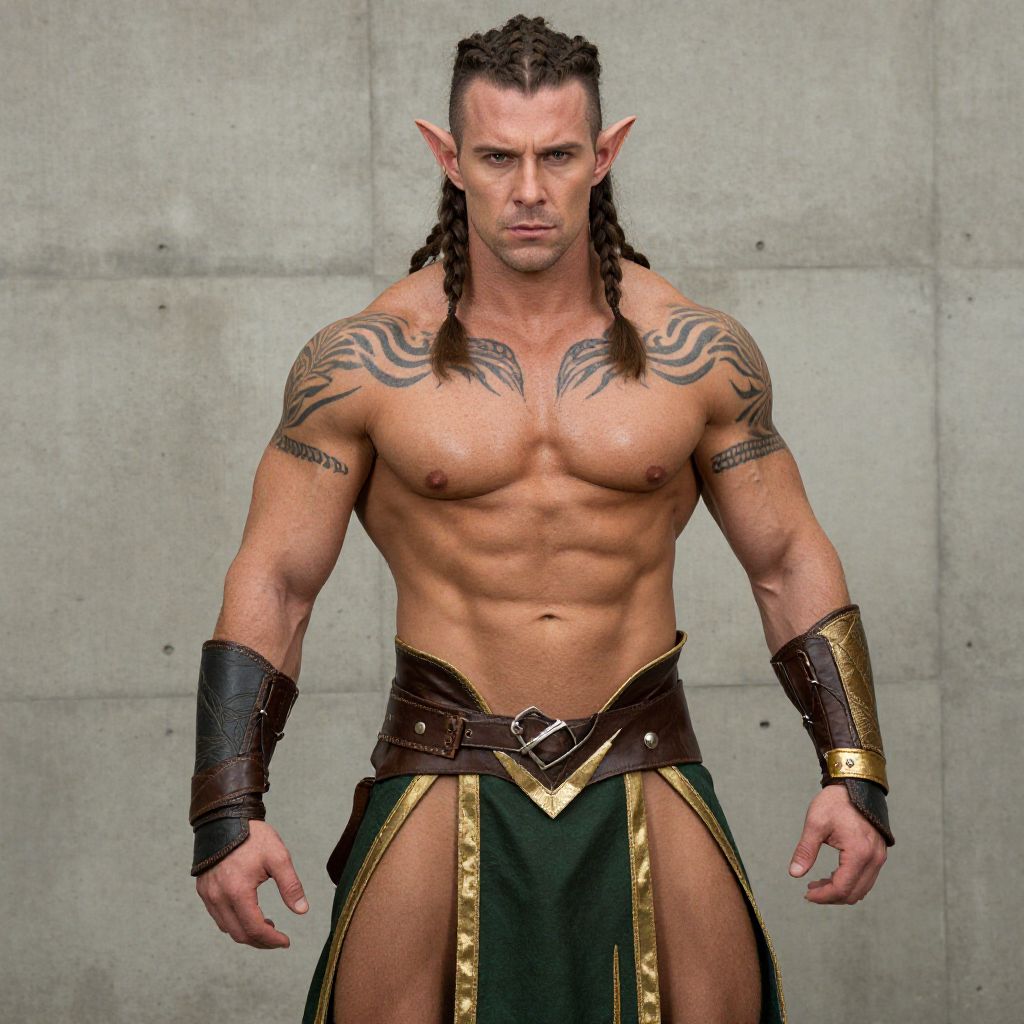 A muscular man with braided hair and elf-like pointed ears poses confidently against a concrete wall. He wears a fantasy warrior outfit with leather bracers and a green skirt accented with gold trim, complemented by tribal tattoos across his chest and shoulders.