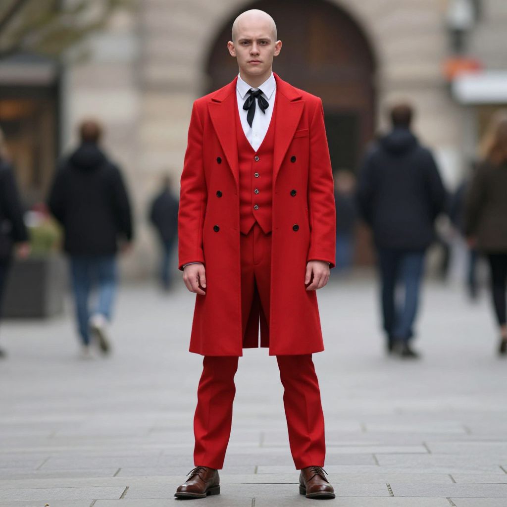 A young man stands confidently on a city street wearing a striking red three-piece suit with a long double-breasted coat and a black ribbon tie. The formal yet bold ensemble contrasts with the blurred background of pedestrians, highlighting contemporary urban fashion with a vintage-inspired twist.