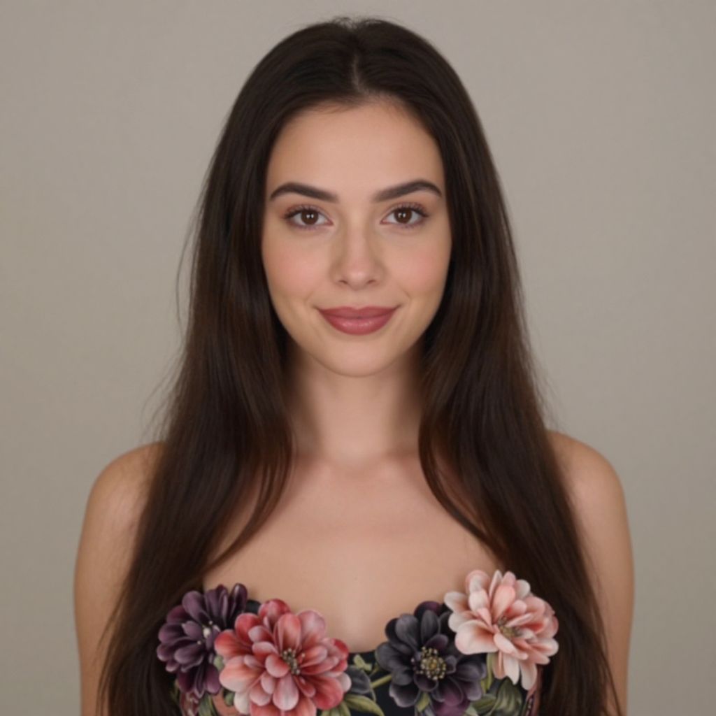 A young woman with long dark hair and natural makeup poses against a neutral backdrop, wearing a floral top adorned with large, soft-colored flowers in shades of pink and purple. The portrait captures serene beauty and subtle elegance with a clean, simple composition.