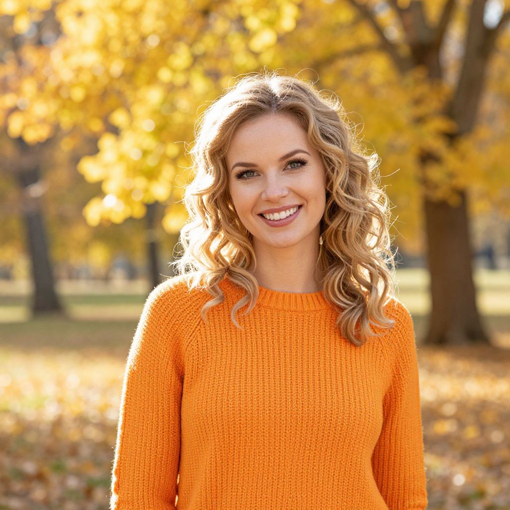 A cheerful young woman with curly blonde hair is smiling warmly at the camera, dressed in a cozy orange sweater that complements the vibrant autumn foliage behind her. The photograph captures the essence of fall with golden leaves and soft natural light creating a serene outdoor setting.