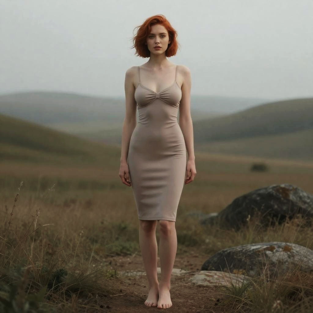 Red-Haired Woman in Beige Dress Standing Barefoot in Outdoor Landscape