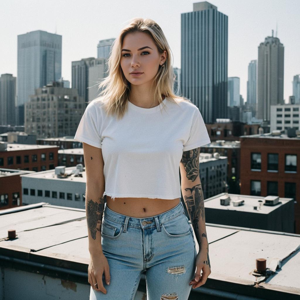 A young woman with blonde hair and visible tattoos on her arms stands confidently on an urban rooftop with a city skyline in the background. She wears a white cropped t-shirt paired with light blue ripped jeans, embodying a casual, modern street style look.