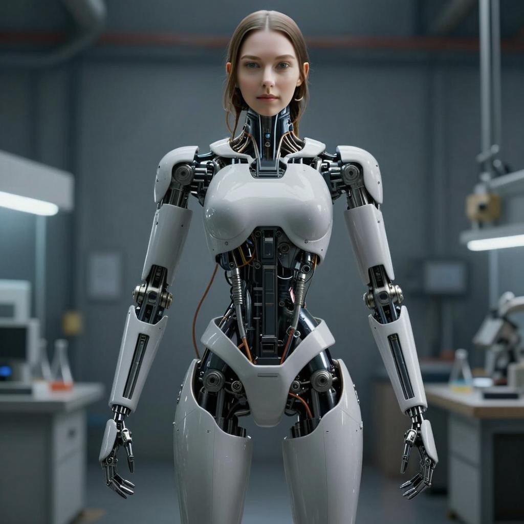 This image features a futuristic humanoid robot with the realistic face of a young woman, blending advanced robotics with human-like features. The sleek, white and black mechanical body emphasizes high-tech engineering and cybernetic design, set against the backdrop of a modern laboratory environment.
