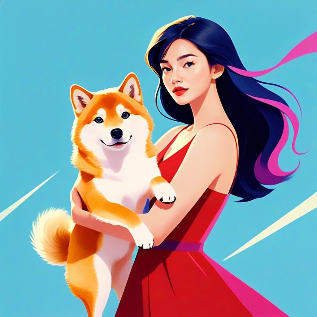 Young Woman Holding Shiba Inu Dog Digital Illustration in Red Dress