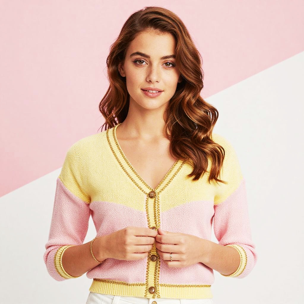 A young woman with wavy brown hair poses confidently against a pastel pink and white geometric background. She is wearing a stylish knitted cardigan featuring bold yellow and pink color blocks trimmed with gold accents, creating a soft and elegant look.