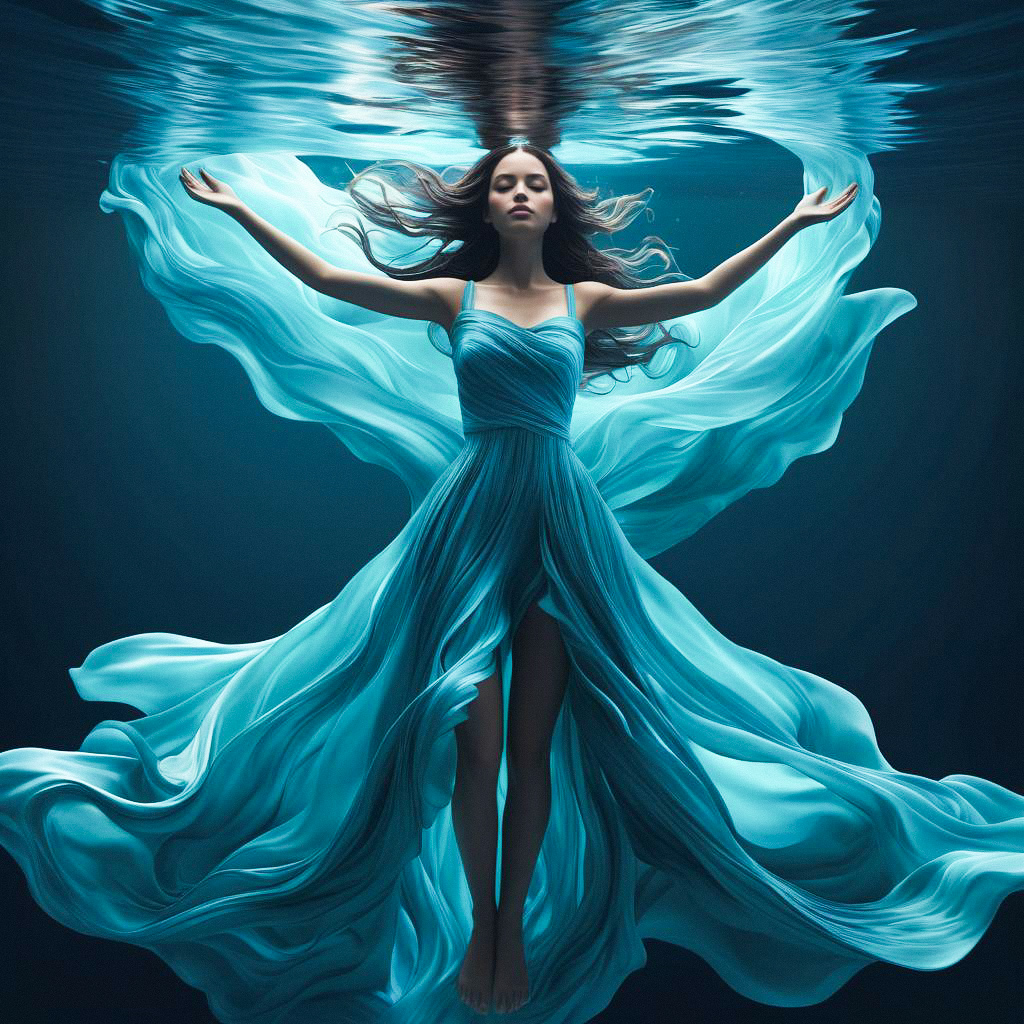 A woman submerged underwater, wearing a flowing blue dress that billows around her in graceful waves. Her arms are extended outward, and her serene expression adds a calm and ethereal atmosphere to the composition.