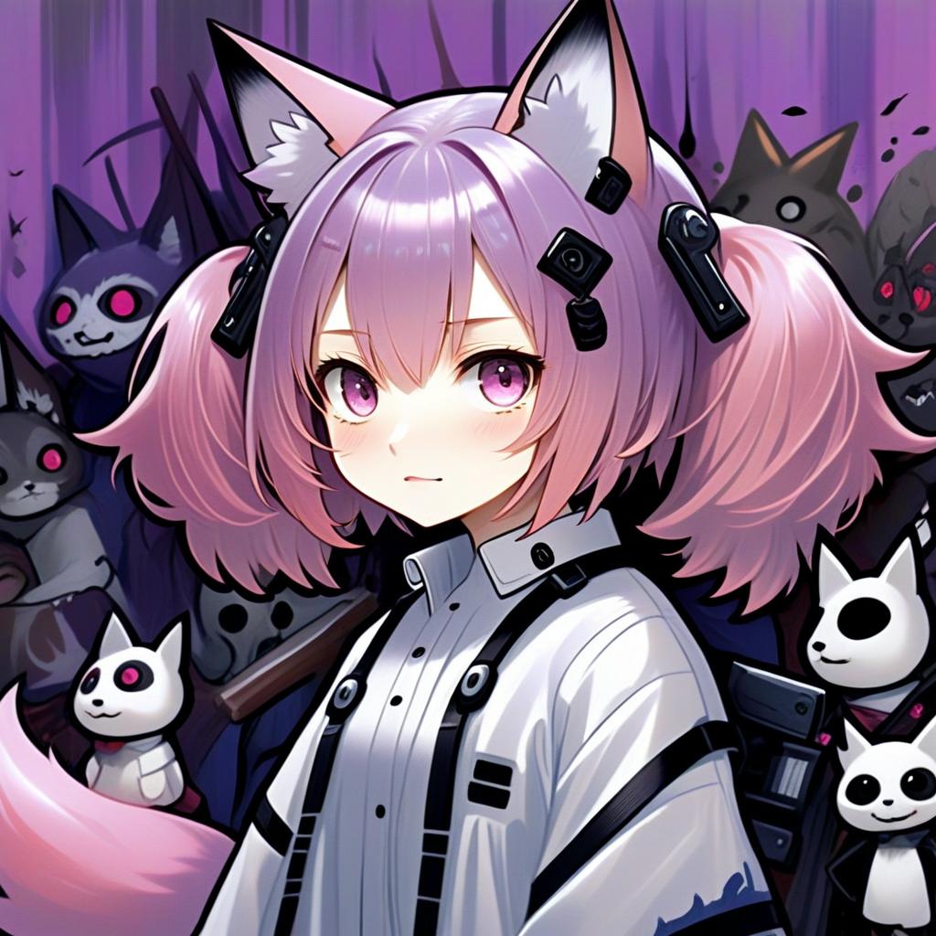 This anime-style illustration features a young woman with pink hair styled into pigtails and fox-like ears, set against a dark, mysterious background filled with eerie cat-like figures with glowing eyes. The character's expression is serious yet delicate, and she wears a modern outfit with black straps and buttons, capturing a unique blend of fantasy and futuristic themes. The artwork combines vibrant color contrasts and detailed shading typical of high-quality digital anime art.
