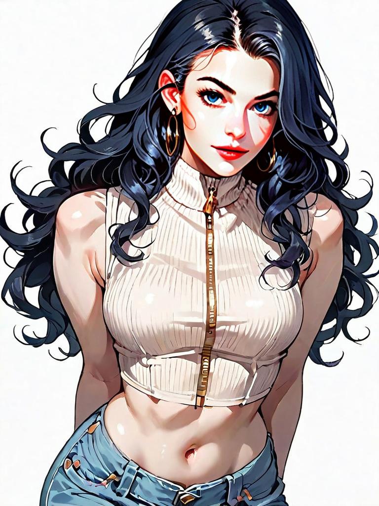 This digital artwork features a strikingly realistic and stylized portrait of a woman with flowing dark hair and piercing blue eyes. She is depicted in an urban-inspired fashion wearing a sleeveless, ribbed zip-up crop top and distressed denim jeans, showcasing a confident and modern look. The illustration blends comic book aesthetics with hyper-realistic detailing, emphasizing vibrant colors and dynamic shading.