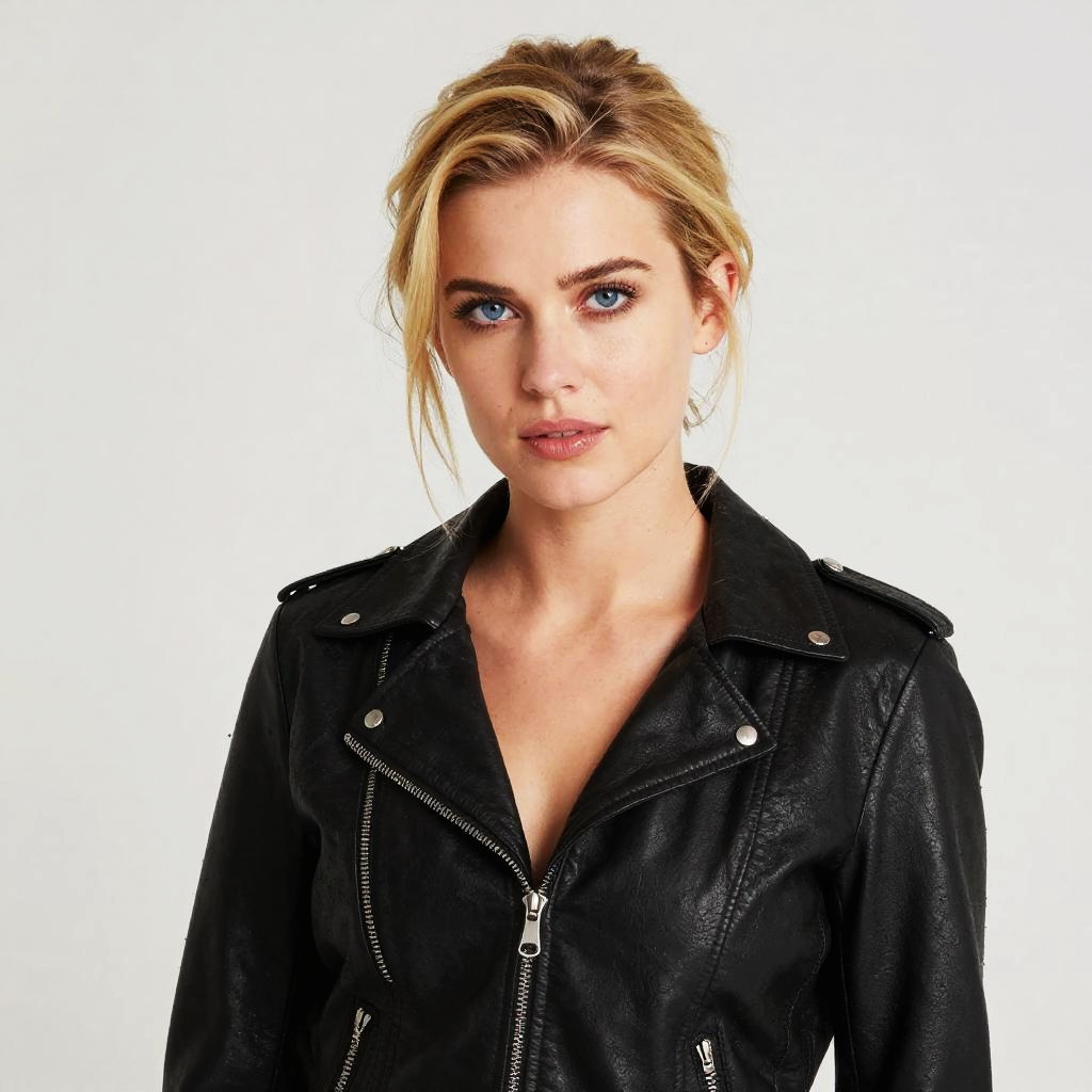 A striking blonde woman with intense blue eyes wears a classic black leather jacket, evoking a stylish and edgy vibe. The image captures a modern, clean portrait that hints at the iconic Grease character style through sleek fashion and confident expression.