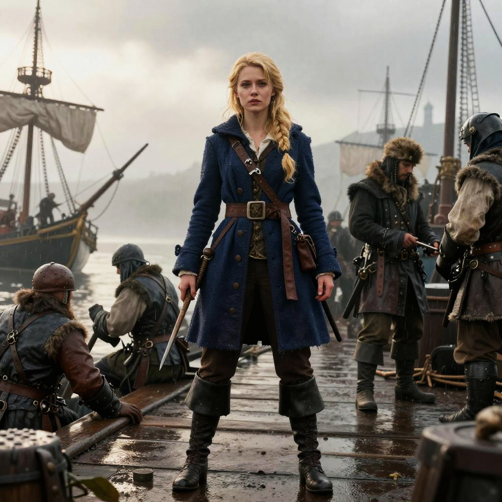 A determined young woman stands confidently on a wet wooden dock, dressed in a dark blue coat with leather belts and boots, holding a dagger. Around her, men in medieval or pirate-style clothing prepare by the ships, creating a dramatic historical or fantasy scene. The moody, overcast sky and detailed costumes enhance the adventurous atmosphere.