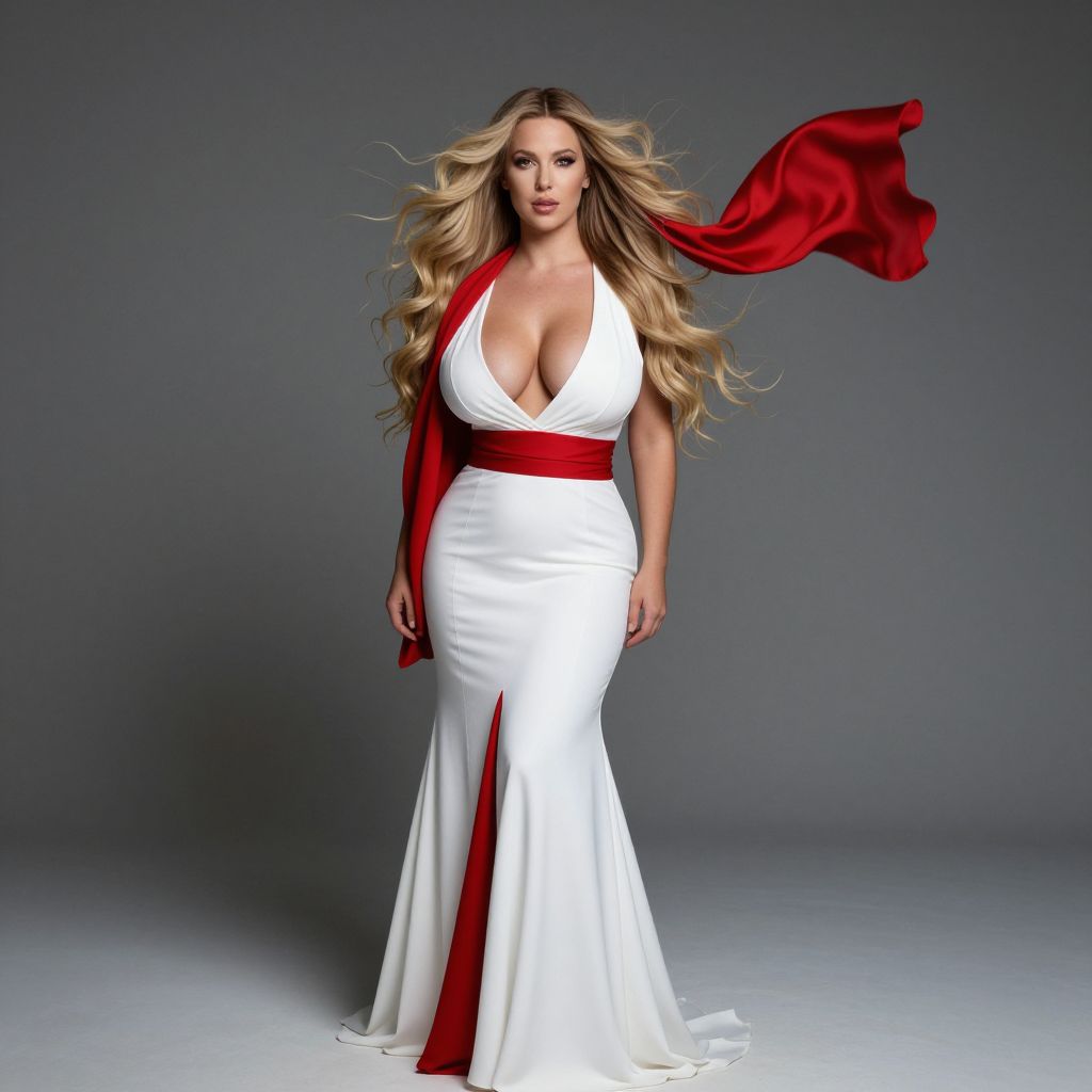 A glamorous woman poses confidently in a form-fitting white gown accented with bold red details, including a flowing scarf and waistband. Her voluminous blonde hair and elegant styling emphasize a sophisticated and dramatic fashion portrait against a simple gray backdrop.