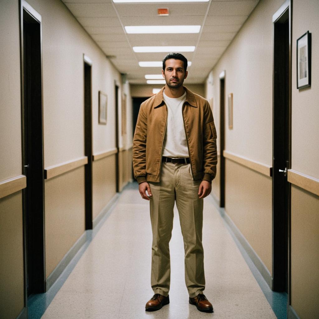 Man in Tan Jacket and Pants Wearing Casual Informal Outfit in Hallway
