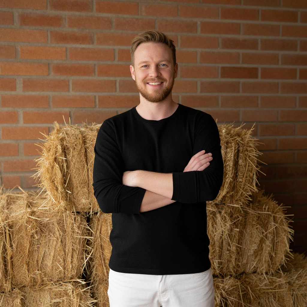 A smiling man with a beard wearing a black long-sleeve shirt and white pants stands confidently with his arms crossed in front of a stack of straw bales against a brick wall. The rustic setting combined with his casual attire creates a relaxed and approachable atmosphere.