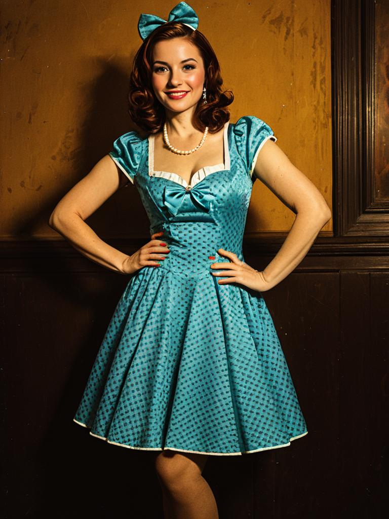 A smiling woman poses confidently in a vibrant blue retro party dress with a matching bow headband, evoking a classic 1950s pin-up style. The vintage-inspired outfit, paired with pearl jewelry and styled red hair, captures the lively atmosphere of a themed party setting.