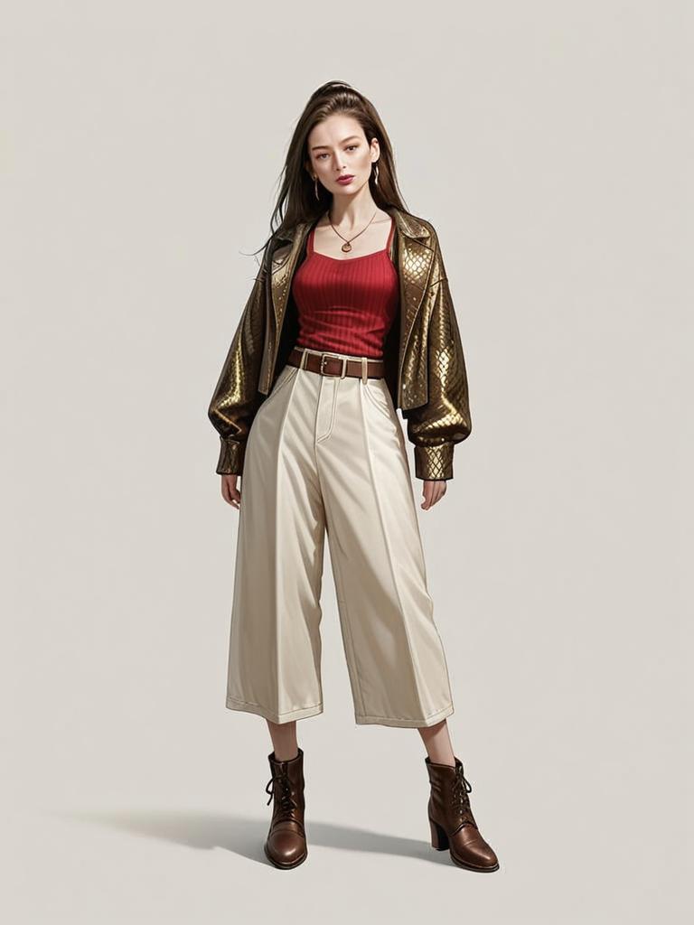 A stylish woman poses confidently wearing a casual-chic outfit comprising a metallic bronze jacket, a ribbed red tank top, and wide-legged beige trousers. Her look is completed with heeled brown lace-up boots, combining modern fashion elements with a relaxed yet sophisticated vibe.