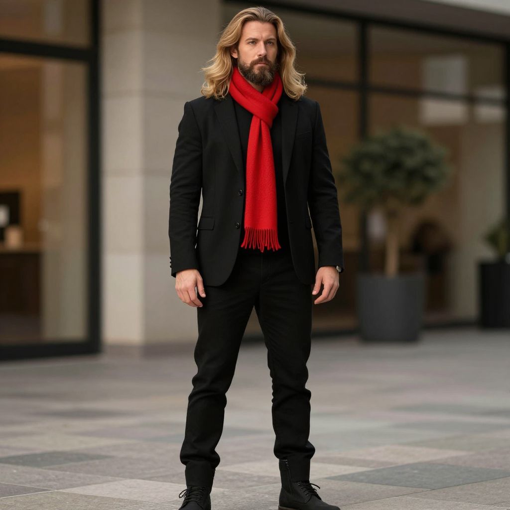 A man with long blonde hair and a beard stands confidently outdoors, dressed in an all-black outfit paired with a striking red scarf. The modern, urban background emphasizes his stylish and sophisticated look, perfect for fall or winter fashion themes.