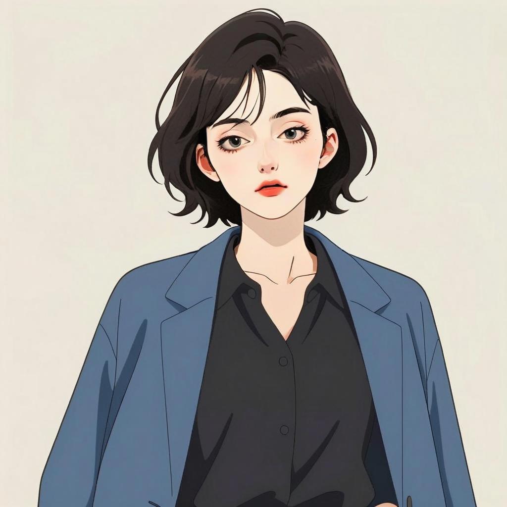 This digital artwork portrays a stylish young woman with short black hair, dressed in a loose blue blazer over a black button-up shirt. The illustration combines clean lines and soft shading, capturing a modern, minimalistic aesthetic with influences from anime and contemporary character design.