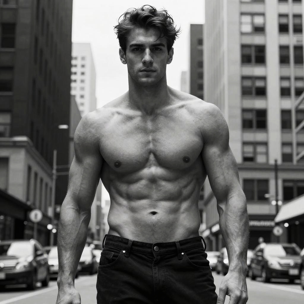 A muscular young man with a chiseled physique stands confidently shirtless in the middle of an urban street. The black and white photograph emphasizes his defined abs and strong features against the backdrop of tall city buildings, capturing a modern, high-contrast fitness portrait style.