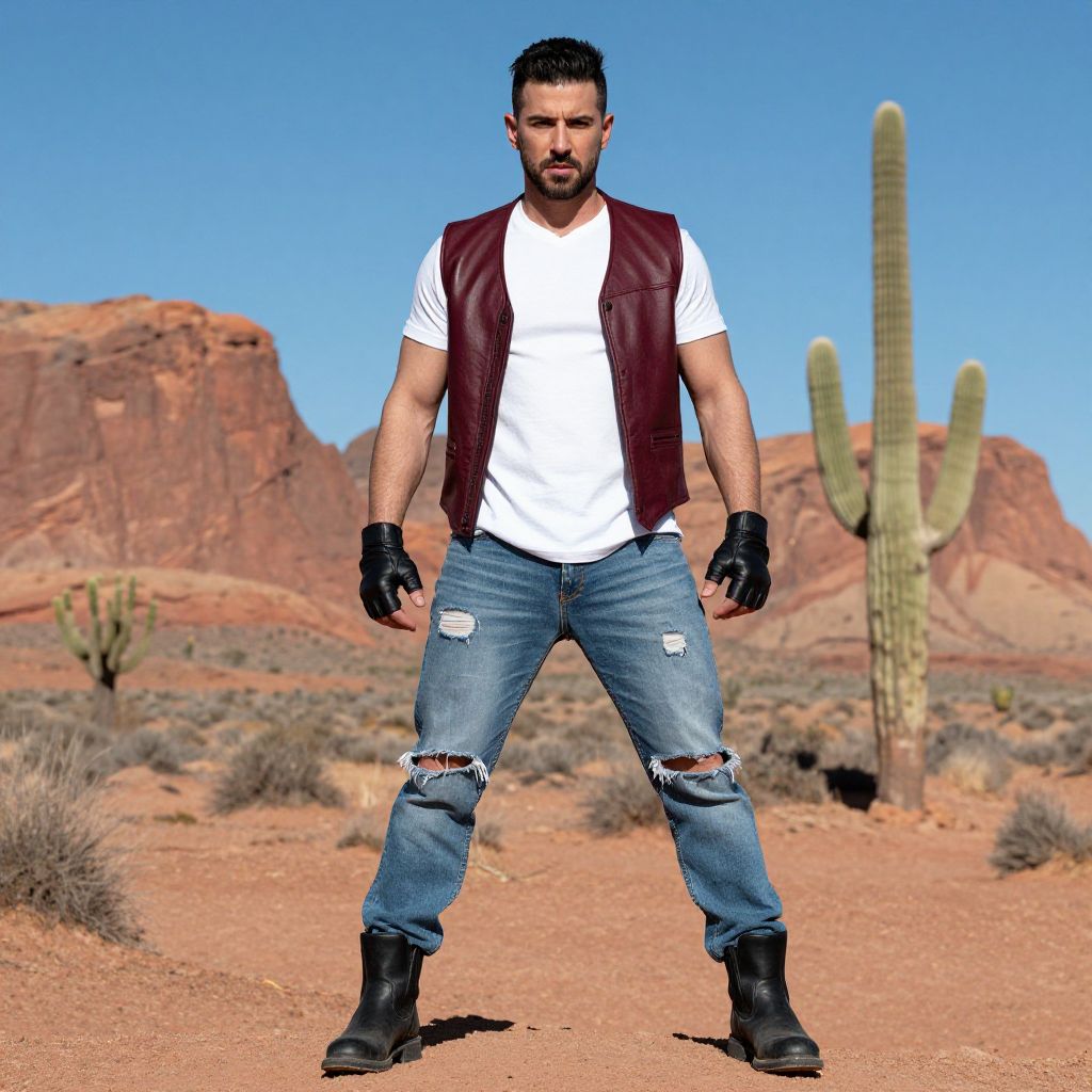 A rugged man stands confidently in a desert landscape featuring red rock formations and tall cacti. He wears a sleeveless maroon leather vest over a white T-shirt, ripped blue jeans, black gloves, and sturdy black boots, embodying a modern western or biker-inspired style.
