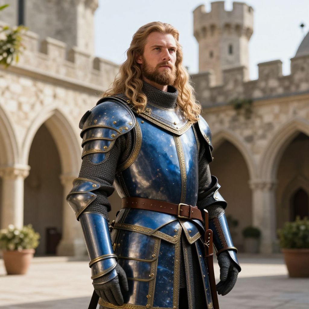 A confident man with long blond hair and a beard is dressed in shining blue medieval armor, standing in a historic castle courtyard. The detailed armor features intricate gold trim and a leather belt, highlighting the blend of strength and elegance in a classic knightly style.