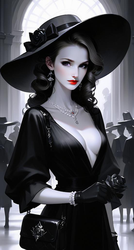 A sophisticated woman dressed in an elegant black gown and wide-brimmed hat stands confidently in a stylish black-and-white setting. Her vibrant red lips and classic vintage jewelry add striking contrast, while her poised demeanor and the subtle background silhouettes suggest a timeless, glamorous atmosphere.