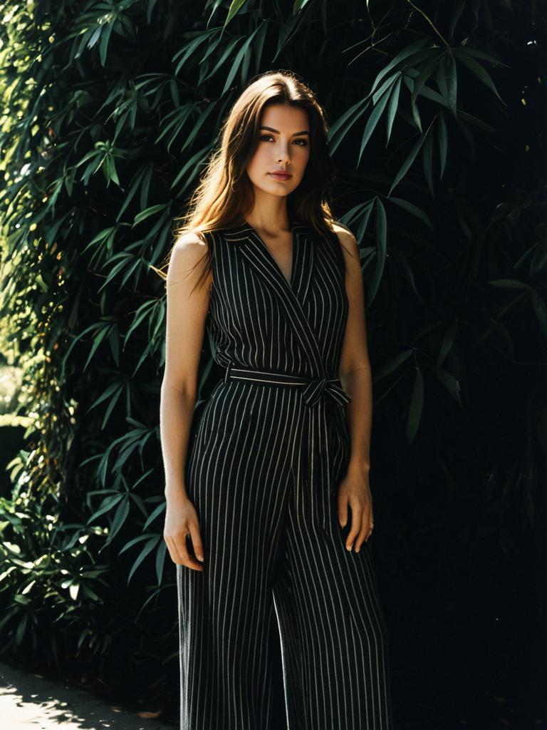 Stylish Woman in Black Pinstripe Jumpsuit Outdoors with Greenery Background