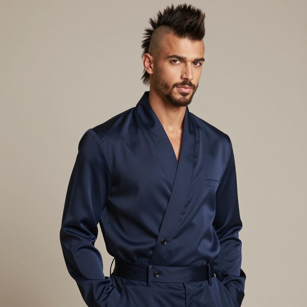 A confident young man with a distinctive mohawk hairstyle poses in a sleek navy blue satin outfit that combines modern fashion with a hint of edgy style. His composed expression and the minimalist beige background highlight both his unique look and the high-quality fabric of his attire.