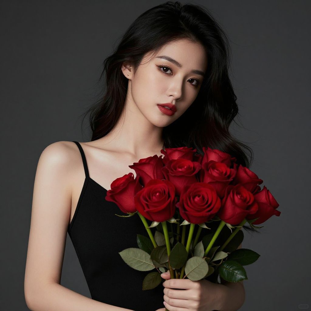 A stylish woman with long dark hair and red lipstick poses against a dark background, holding a vibrant bouquet of red roses. She wears a simple black spaghetti strap top, creating a striking contrast with the deep red flowers, evoking elegance and romance.