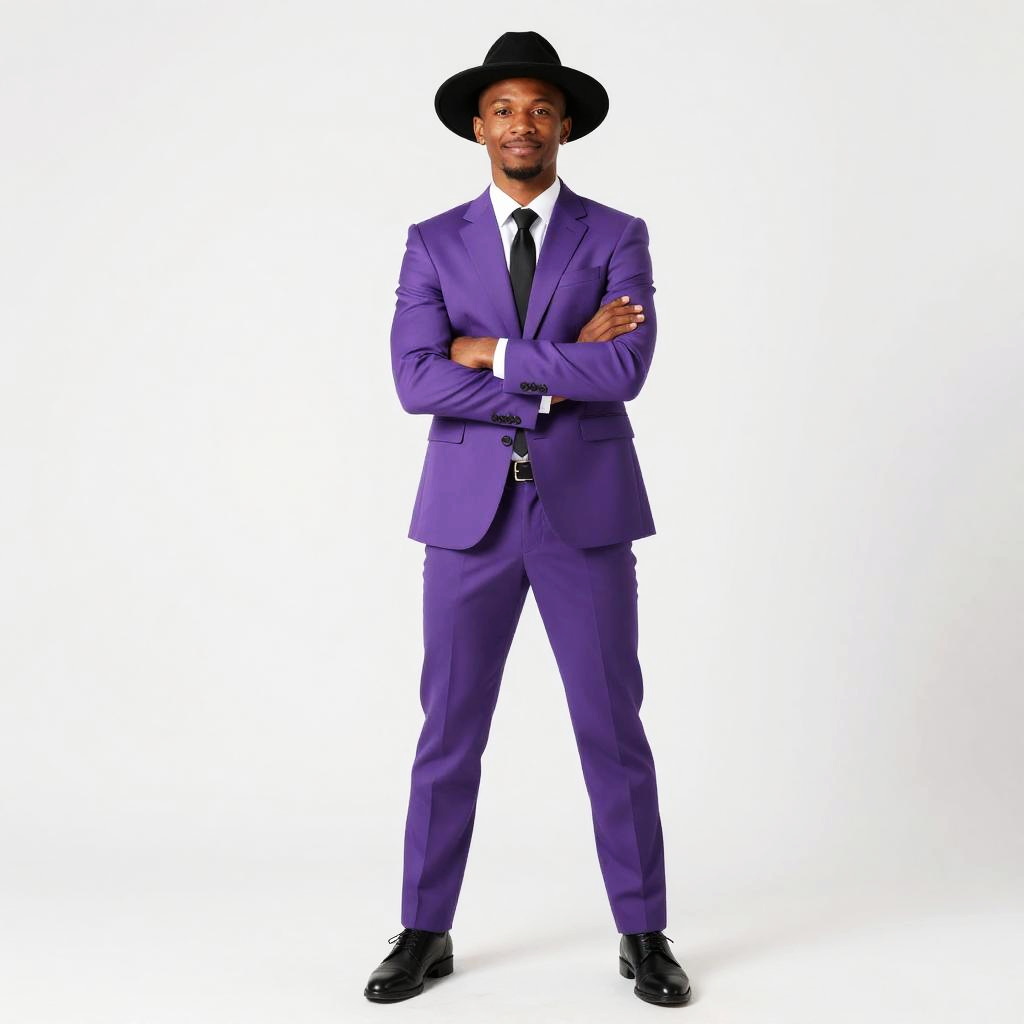 Confident Man in Purple Suit Wearing Black Hat