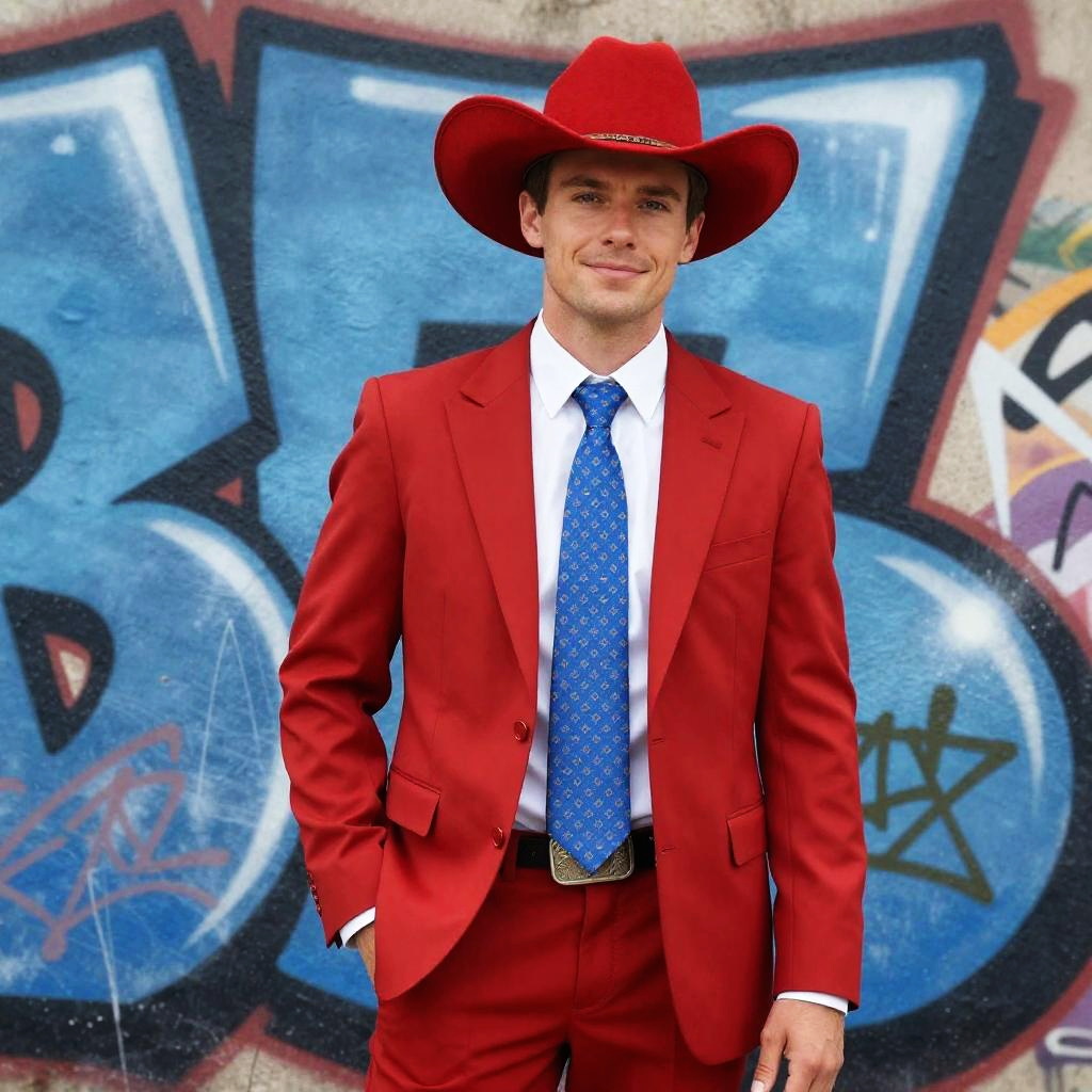 A confident young man dressed in a striking red suit and matching cowboy hat poses against a graffiti-covered wall. His blue patterned tie and belt buckle add stylish contrast, highlighting a modern blend of Western and urban street fashion.