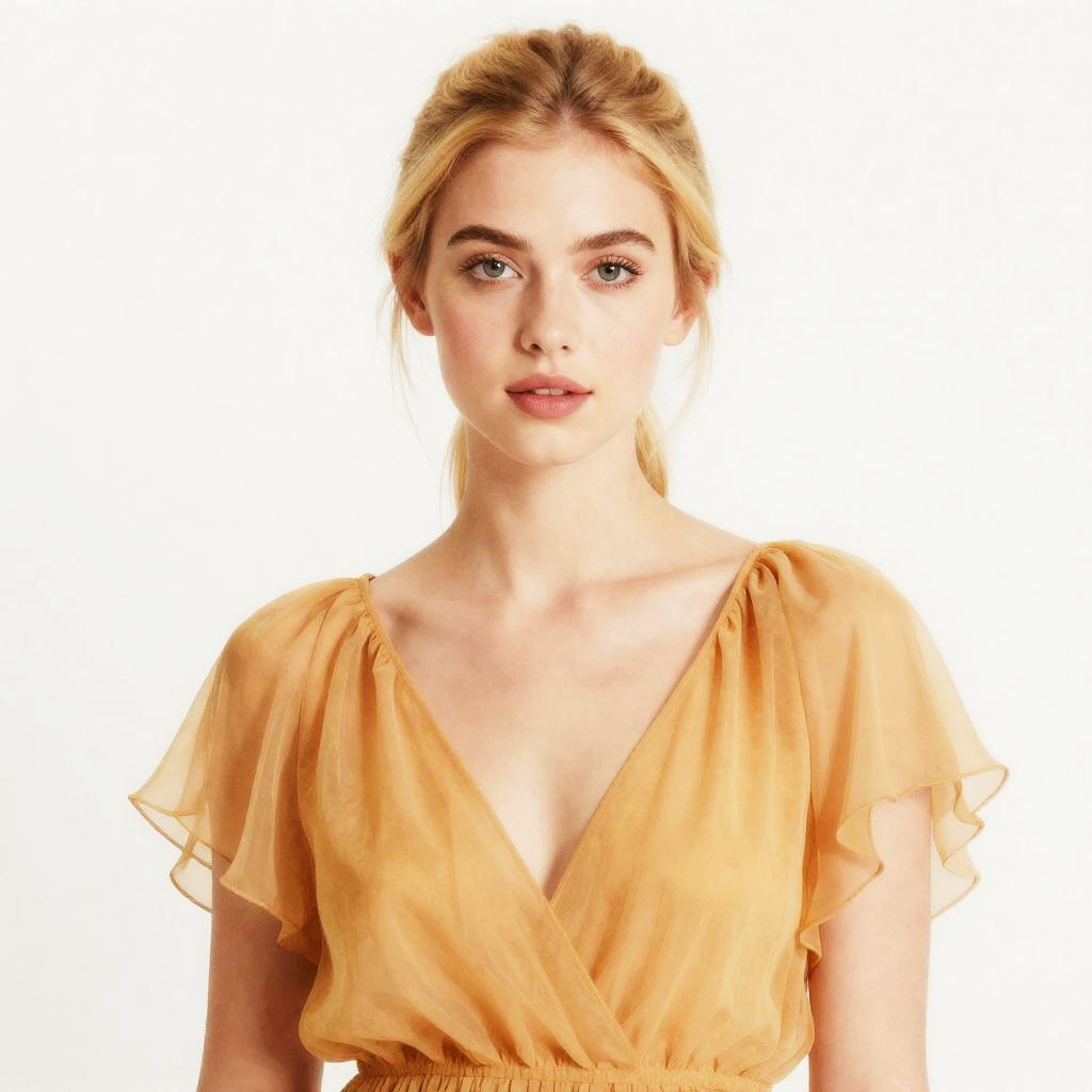A young woman with blonde hair styled in a loose ponytail wears a flowing, sheer amber-colored blouse with flutter sleeves. The soft lighting and neutral background highlight her natural beauty and the delicate texture of the fabric, creating an elegant and fresh portrait.