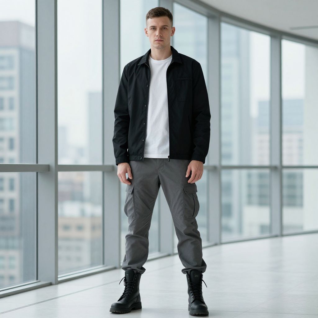 A young man stands confidently in a modern, glass-walled building wearing a casual black jacket, white t-shirt, gray cargo pants, and black combat boots. The clean, minimalist interior and cityscape background create a contemporary urban atmosphere.