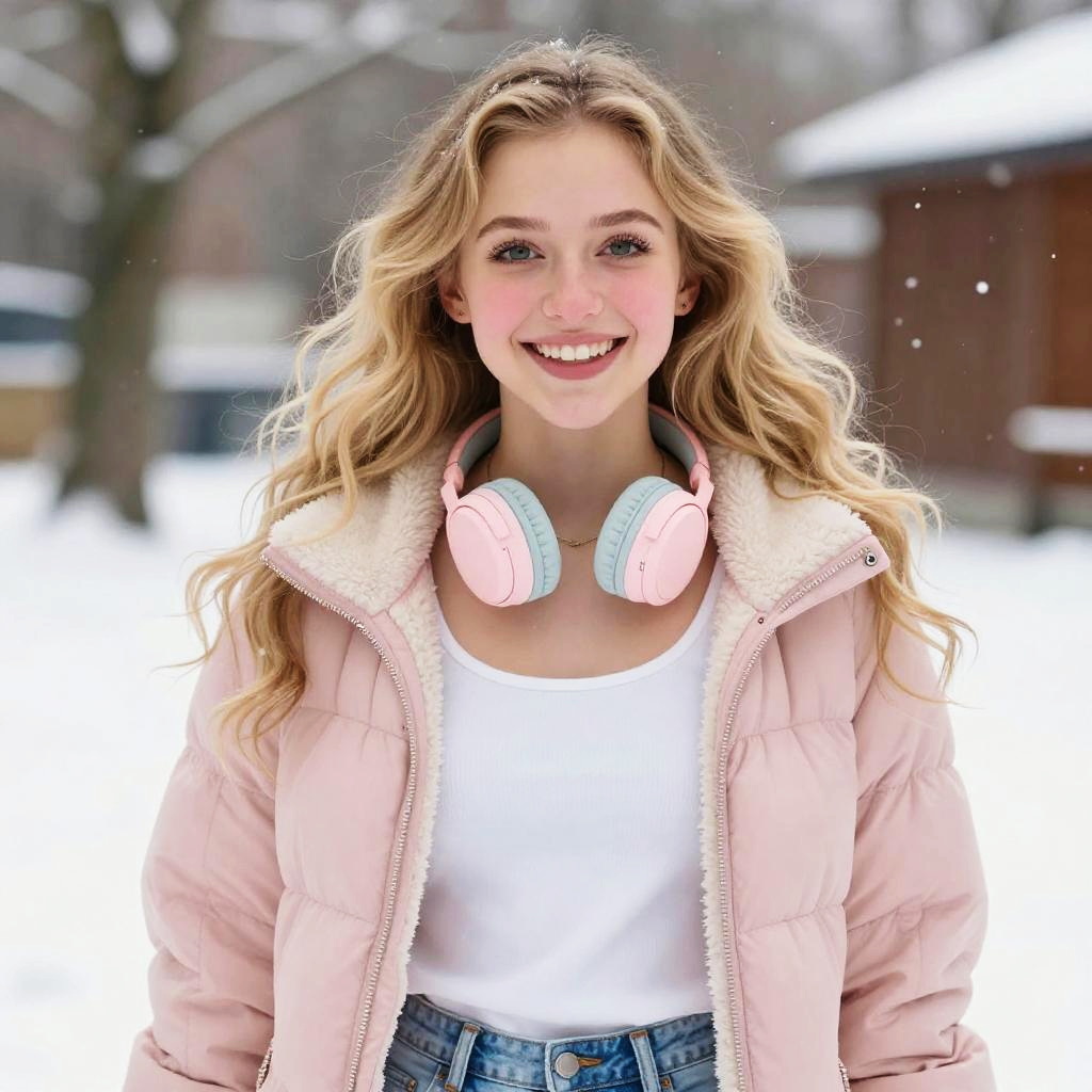 A smiling young woman with long blonde hair enjoys a snowy winter day, dressed in a pink puffer jacket with a white fleece lining and a white tank top. She wears pastel pink and blue headphones around her neck, standing outdoors with snow gently falling and trees blurred in the background.