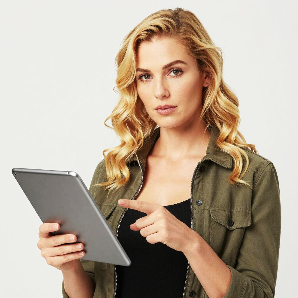 A confident blonde woman with wavy hair is using a tablet, dressed casually in an olive green jacket over a black top. The image captures her focused expression as she interacts with the device in a clean, minimal studio setting.