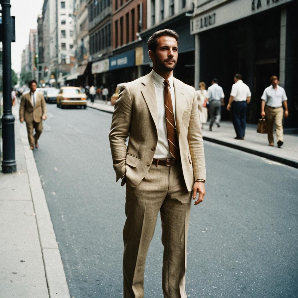 A man wearing a stylish tan linen suit with a white shirt and brown tie stands confidently on a city street, embodying a classic and sophisticated fashion style. The urban background, featuring blurred pedestrians and buildings, complements the timeless elegance of his outfit.