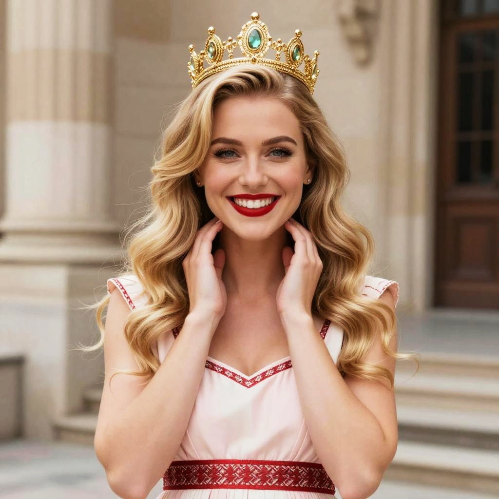 A radiant blonde woman wears a golden jeweled crown and smiles brightly, exuding confidence and elegance. Her wavy hair and classic red lipstick complement her soft pink dress with intricate red detailing, set against an elegant architectural background.