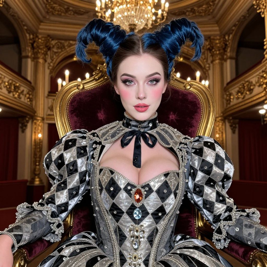 A woman dressed in an elaborate, Rococo-inspired harlequin costume poses regally on a plush, ornate throne in a lavishly decorated room with golden embellishments and chandeliers. Her striking hairstyle and detailed makeup complement the intricate black and silver diamond-patterned dress adorned with jewels and lace.