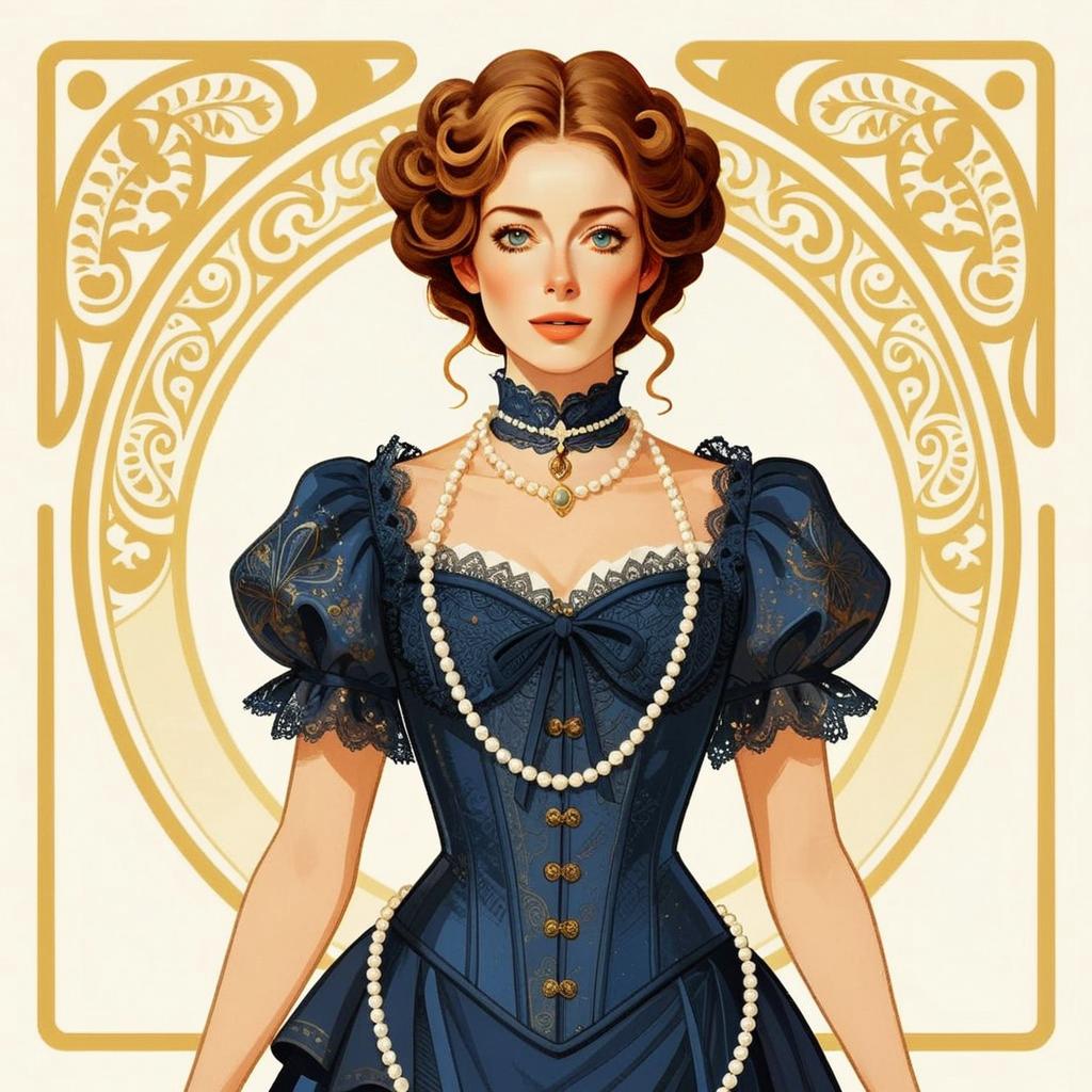A beautifully illustrated woman in a detailed Victorian-style dark blue dress adorned with lace, pearls, and gold accents stands poised against an ornate golden circular background. Her styled curly hair and delicate jewelry complement the elegant and refined aesthetic, capturing the essence of classic portraiture with a modern digital art twist.