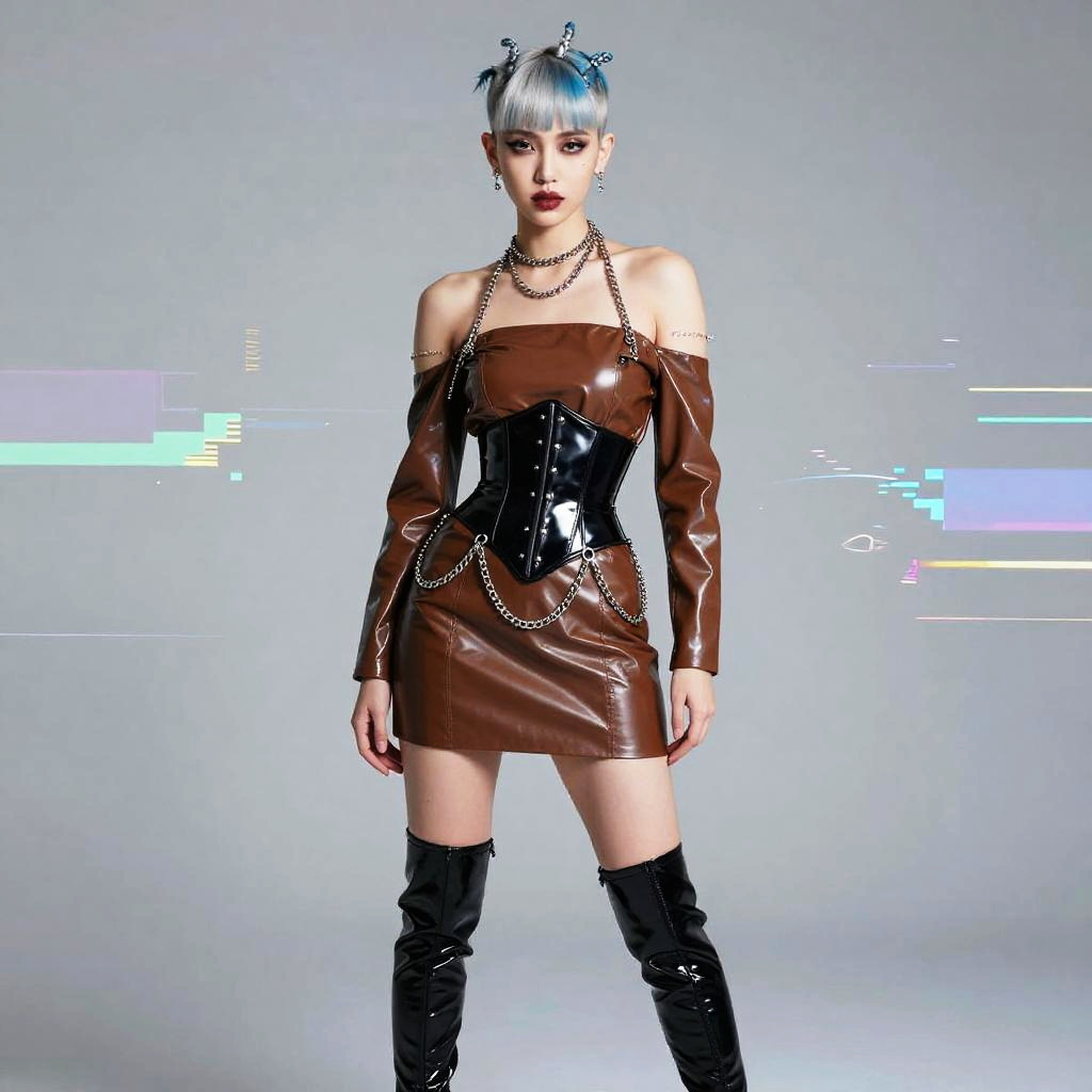 A stylish Gen Z woman poses confidently in a modern, edgy outfit featuring a brown leather off-shoulder mini dress paired with a shiny black corset and matching thigh-high boots. Her silver-blue hair styled in space buns and bold makeup highlight the futuristic, street fashion vibe of the image.