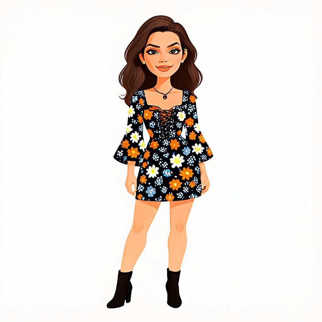 Bohemian Style Woman in Floral Dress with Long Brown Hair and Ankle Boots