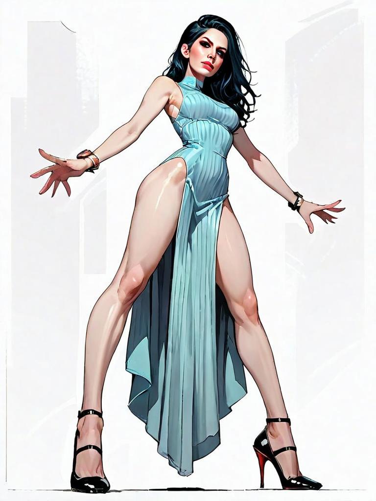 This digital artwork features a confident woman striking a dynamic full-body pose in a stylish, modern blue bodycon dress with high slits, highlighting her strong and poised stance. Rendered in a realistic comic book style, the illustration showcases detailed shading and vibrant colors that emphasize the figure's form and expression.