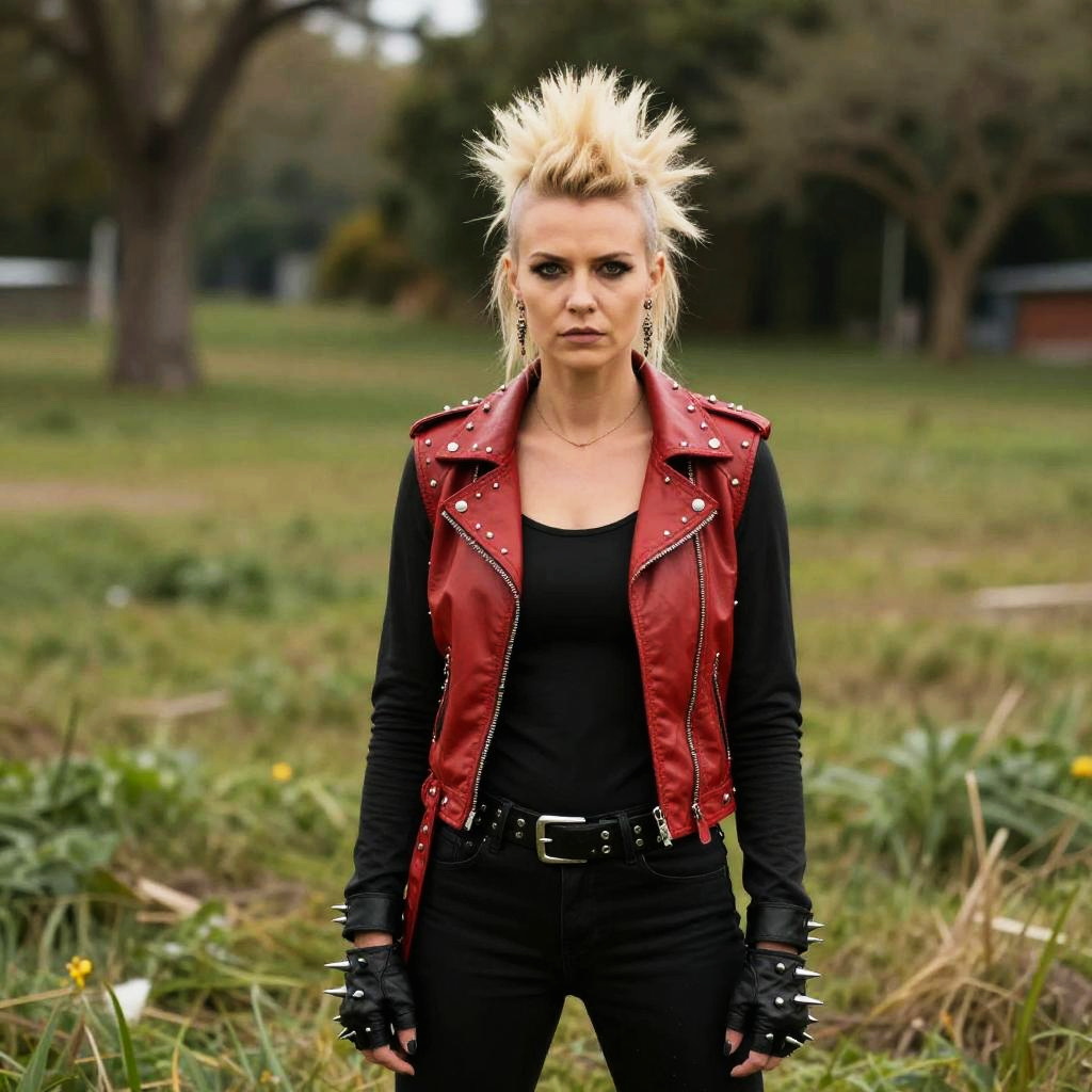 Edgy Punk Rock Woman with Spiked Red Leather Vest Outdoors