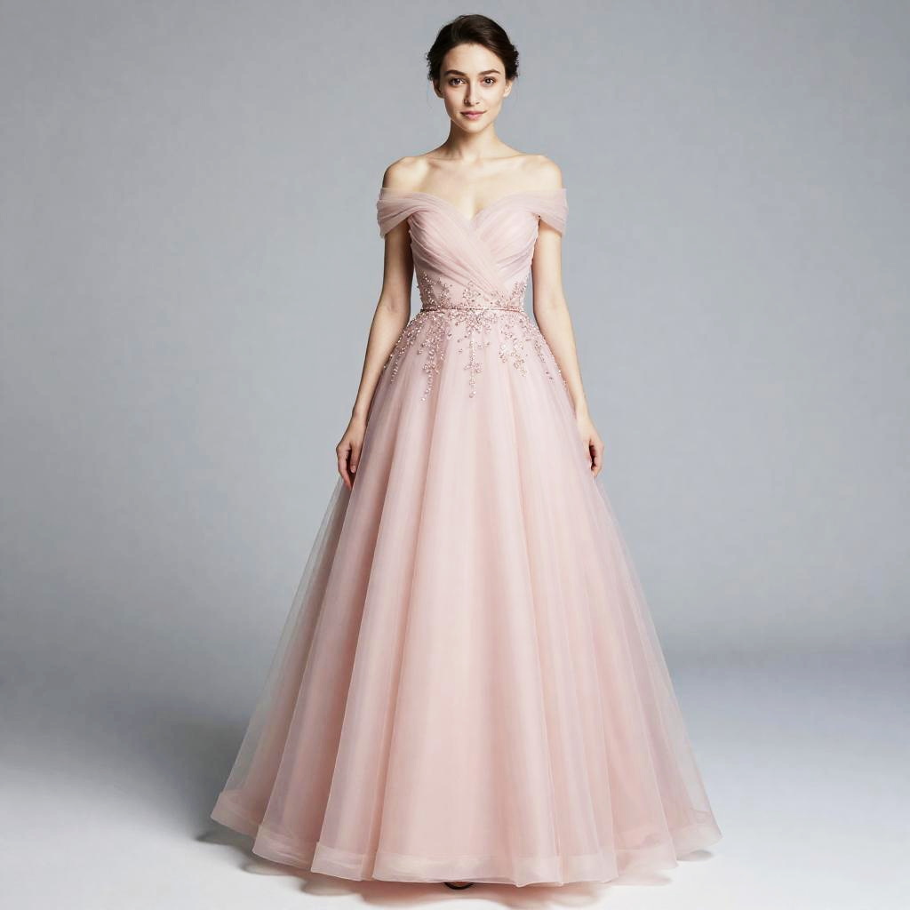 Elegant Woman in Pink Off-Shoulder Ball Gown with Floral Embellishments