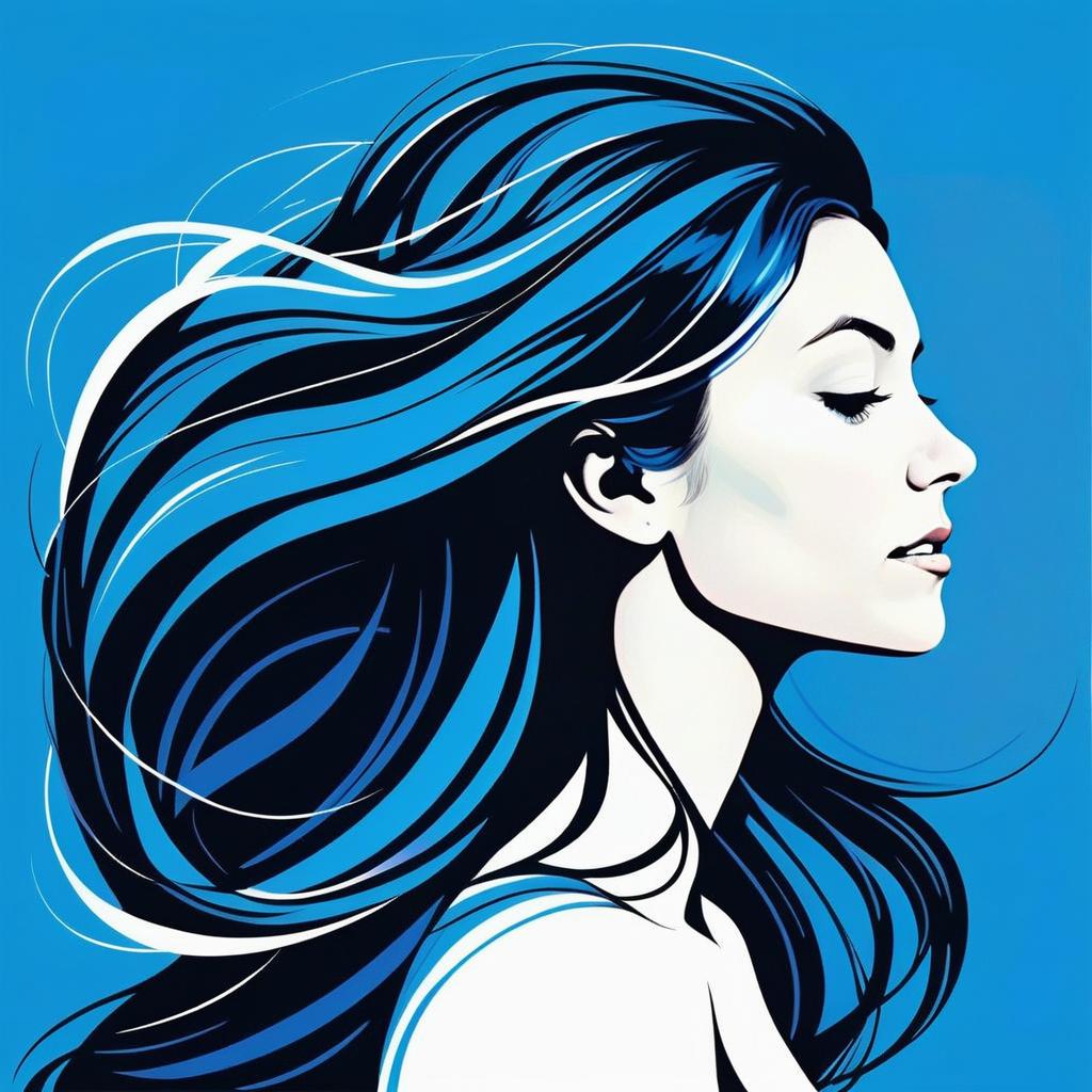A stylized digital illustration of a woman in profile with flowing hair highlighted in shades of blue and black, set against a solid blue background. The artwork emphasizes elegant line work and smooth shading, capturing a serene and contemplative mood.