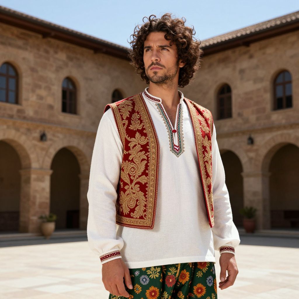 A man with curly hair stands confidently in a courtyard wearing traditional attire featuring a richly embroidered red vest over a white long-sleeve shirt with intricate embroidered details around the collar and cuffs. His floral-patterned pants add a vibrant contrast to the classic and cultural outfit, blending heritage with a stylish modern look.