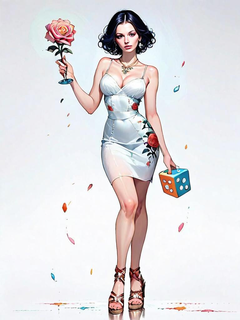 A striking digital illustration of a woman standing in a full-body pose, wearing a fitted white dress adorned with red rose patterns. She holds a large pink rose in one hand and a colorful blue and orange dice in the other, set against a minimalistic, light background with scattered petals enhancing the romantic and elegant atmosphere.
