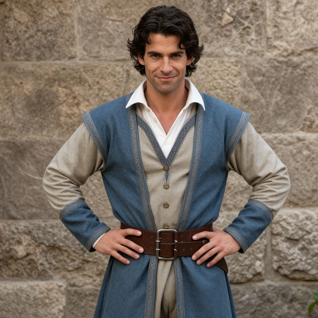 A confident man dressed in a medieval-style costume stands against a stone wall with his hands on his hips, wearing a blue and beige tunic with decorative trim and a wide brown belt. His slight smile and relaxed posture convey a sense of pride and readiness.