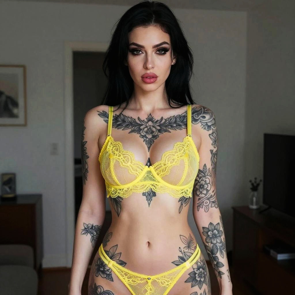 A confident woman with striking dark hair poses in a bright yellow lace lingerie set, showcasing an impressive array of floral tattoos covering her arms, chest, and torso. The intimate indoor setting features a muted background that emphasizes her bold style and detailed body art.