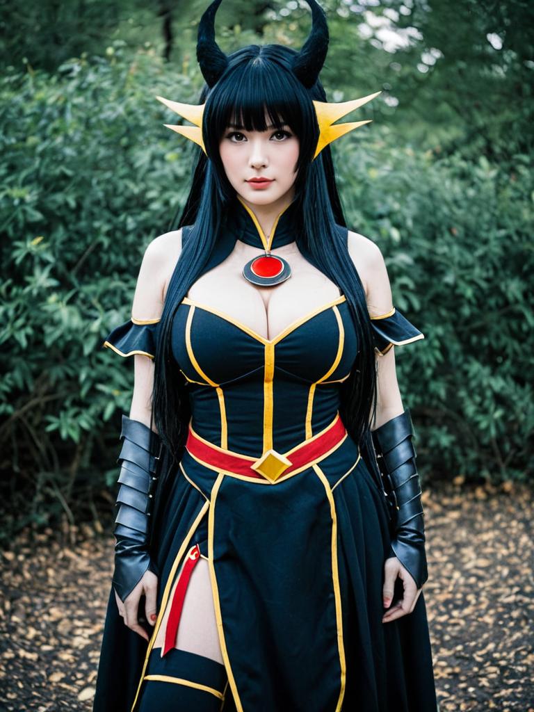 A woman dressed in a detailed fantasy cosplay outfit featuring black and gold accents with a red gemstone centerpiece, styled with long black hair, prominent horns, and matching accessories. The photo captures a strong, mysterious character portrayed in an outdoor natural setting. The costume design suggests influence from anime or video game fantasy themes.